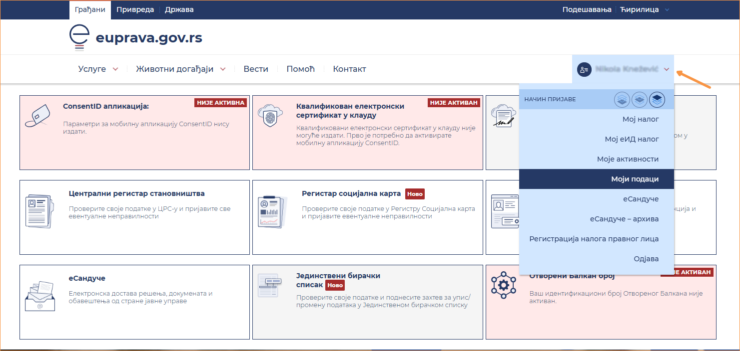 Izbor opcije Moji podaci na portalu eUprave.