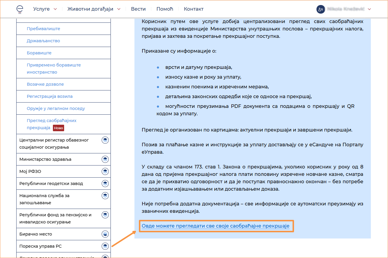 5) Otvoriće se stranica sa informacijama, a pri dnu te stranice treba da kliknete na link Ovde možete pregledati sve svoje saobraćajne prekršaje.