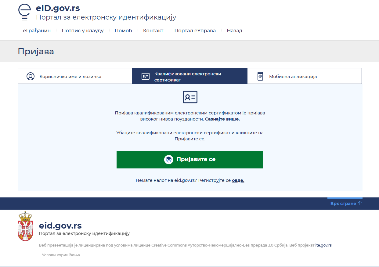 Izgled početne strane portala eUprava. Uokviren odeljak za prijavu/registraciju korisnika. Prijava korisnika eUprave kvalifikovanim elektronskim sertifikatom.