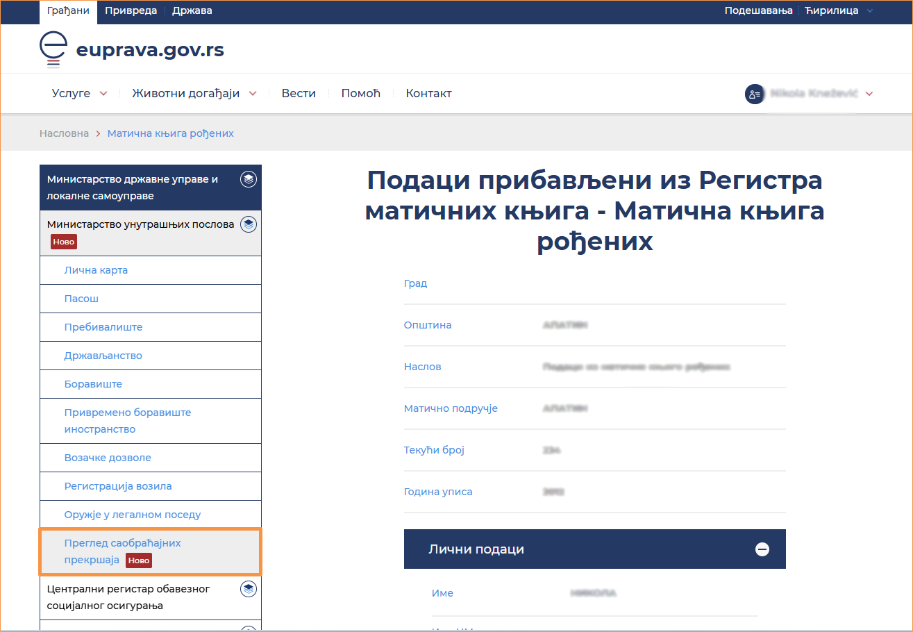 4) U levoj koloni odaberite Ministarstvo unutrašnjih poslova pa Pregled saobraćajnih prekršaja.